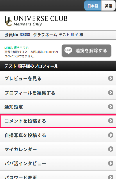 自分のプロフィール部分に掲載されるコメントを書くことが出来る機能です。